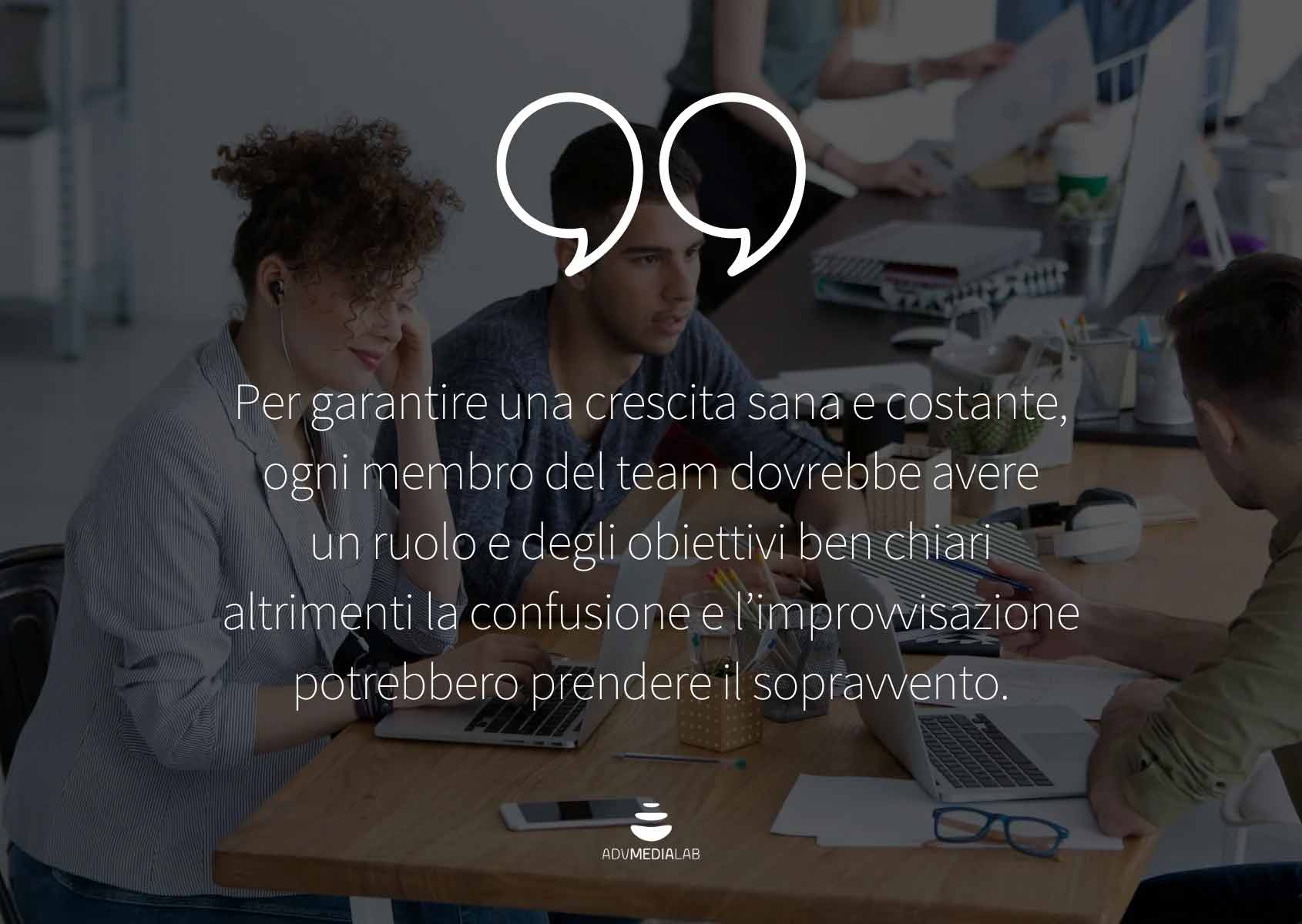 Per garantire una crescita sana e costante, ogni membro del team dovrebbe avere un ruolo e degli obiettivi ben chiari altrimenti la confusione e l’improvvisazione potrebbero prendere il sopravvento.